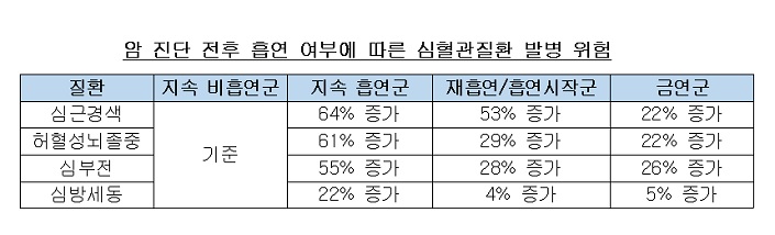 ¿¬±¸ÆÀÀº ¾Ï Áø´Ü ÀüÈÄ Èí¿¬ ½À°ü º¯È¿¡ µû¶ó ȯÀÚµéÀ» ³× ±×·ìÀ¸·Î ³ª´² ½ÉÇ÷°üÁúȯ ¹ß»ý À§ÇèÀ» ºñ±³Çß´Ù. ±× °á°ú, ¾Ï Áø´Ü ÀüÈÄ Áö¼Ó Èí¿¬±ºÀº ºñÈí¿¬±º ´ëºñ ½ÉÇ÷°üÁúȯ ¹ß»ý À§ÇèÀÌ ¶Ñ·ÇÇÏ°Ô ³ô¾Ò´Ù.
