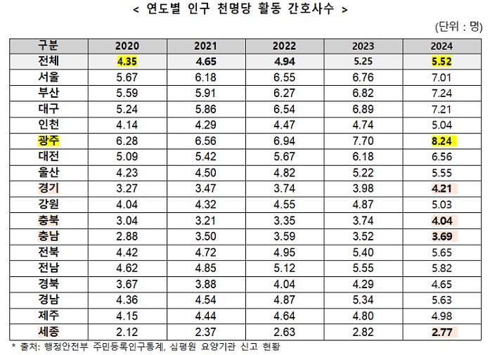 ´õºÒ¾î¹ÎÁÖ´ç ¼¹ÌÈ ±¹È¸ÀÇ¿ø(º¸°Çº¹ÁöÀ§¿øÈ¸ ¼Ò¼Ó)ÀÌ º¸°Çº¹ÁöºÎ·ÎºÎÅÍ Á¦Ãâ¹ÞÀº ‘¿¬µµº°·±¤¿ª½Ãµµº° Àα¸ 1000¸í´ç Ȱµ¿ °£È£»ç ¼ö’ ÀÚ·á¿¡ µû¸£¸é 2024³â ±âÁØ °£È£»ç°¡ °¡Àå ¸¹Àº ±¤ÁÖ±¤¿ª½Ã(8.24¸í)¿Í °¡Àå ÀûÀº ¼¼Á¾Æ¯º°ÀÚÄ¡½Ã(2.77¸í) °£ÀÇ °ÝÂ÷´Â ¹«·Á 3¹è¿¡ ´ÞÇß´Ù. ¼¼Á¾(2.77¸í), Ãæ³²(3.69¸í), ÃæºÏ(4.04¸í), °æ±â(4.21¸í) µîÀº ¿©ÀüÈ÷ Àü±¹ Æò±Õ(4.35¸í, 2020³â ±âÁØ)¿¡µµ ¸ø ¹ÌÄ¡´Â ¼öÁØÀ¸·Î, Áö¹æ ÀÇ·áÇöÀåÀÇ Àη³ÀÌ ¿©ÀüÇÔÀ» º¸¿©Áá´Ù.