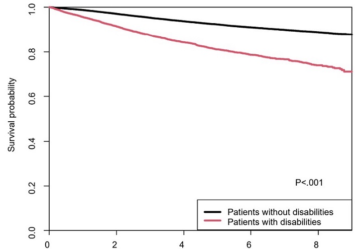 ÀÌ·¯ÇÑ °ÝÂ÷´Â °á±¹ »ýÁ¸À²ÀÇ Â÷ÀÌ·Î ³ªÅ¸³µ´Ù. ¾ÏÀ» Á¶±â¿¡ ¹ß°ßÇØ ¼ö¼úÀ» ¸¶Ä£ ȯÀڵ鸸 µû·Î ºÐ¼®ÇßÀ» ¶§µµ, ÁßÁõ Àå¾Ö ȯÀÚ´Â ºñÀå¾ÖÀκ¸´Ù À¯¹æ¾ÏÀ¸·Î ÀÎÇÑ »ç¸Á À§ÇèÀÌ 3.16¹è ³ô¾Ò´Ù. 5³â »ýÁ¸À² ¶ÇÇÑ ºñÀå¾ÖÀÎÀº 92.4%¿¡ ´ÞÇßÀ¸³ª Àå¾Ö ȯÀÚ´Â 81.1%¿¡ ¸Ó¹°·¶´Ù.
