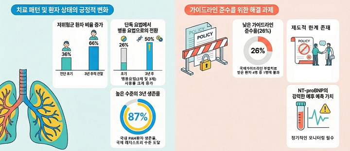 Èñ±Í ÆóÇ÷°ü ÁúȯÀÎ Æóµ¿¸Æ°íÇ÷¾Ð(PAH) ȯÀÚµéÀ» 5³â°£ ÃßÀû °üÂûÇÑ °á°ú ÃʱâºÎÅÍ ¿©·¯ ¾àÁ¦¸¦ »ç¿ëÇÏ´Â ‘º´ÇÕ¿ä¹ý’ÀÌ È¯ÀÚÀÇ »ýÁ¸À²°ú À§Çèµµ¸¦ À¯ÀǹÌÇÏ°Ô °³¼±ÇÑ °ÍÀ¸·Î ³ªÅ¸³µ´Ù. ´Ù¸¸, ±¹³» ÀÇ·á ÇöÀåÀÇ °¡À̵å¶óÀÎ ÁؼöÀ²Àº ¿©ÀüÈ÷ ³·¾Æ Á¦µµÀû º¸¿ÏÀÌ ½Ã±ÞÇÏ´Ù´Â ÁöÀûÀÌ´Ù.