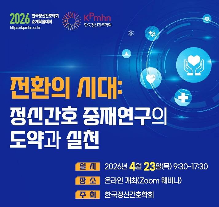 Çѱ¹Á¤½Å°£È£ÇÐȸ°¡ ¿À´Â 4¿ù 23ÀÏ ‘ÀüȯÀÇ ½Ã´ë: Á¤½Å°£È£ ÁßÀ翬±¸ÀÇ µµ¾à°ú ½Çõ’À» ÁÖÁ¦·Î 2026³â Ãá°èÇмú´ëȸ¸¦ °³ÃÖÇÑ´Ù.