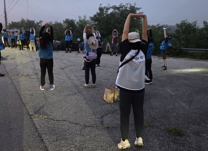 »õº® 4½Ã. ¿©´À ¶§Ã³·³ ÇÏ·ç´Â Á¶¿ëÈ÷ ½ÃÀ۵ƴÙ. ¼÷¼Ò Àα٠½Ä´ç¿¡ ¸ðÀÎ Âü°¡ÀÚµéÀº °£´ÜÇÑ ¾ÆÄ§À» ¸¶Ä£ µÚ, 5½ÃºÎÅÍ ´Ù½Ã DMZ °È±â ÇàÁøÀ» À̾´Ù. ÇÑ Âü°¡ÀÚ°¡ Çà»ç Àü ÀÕ¸ö ÅëÁõÀ» È£¼ÒÇÏÀÚ, ÇöÀå¿¡ ÇÔ²²ÇÑ °£È£µ¹º½ºÀ»çÆÀÀº ¸Á¼³ÀÓ ¾øÀÌ ÁøÅëÁ¦¸¦ °Ç³Þ´Ù. À̳¯ÀÇ Ã¹ Äɾ ±×·¸°Ô ½ÃÀ۵ƴÙ.
