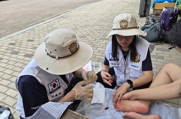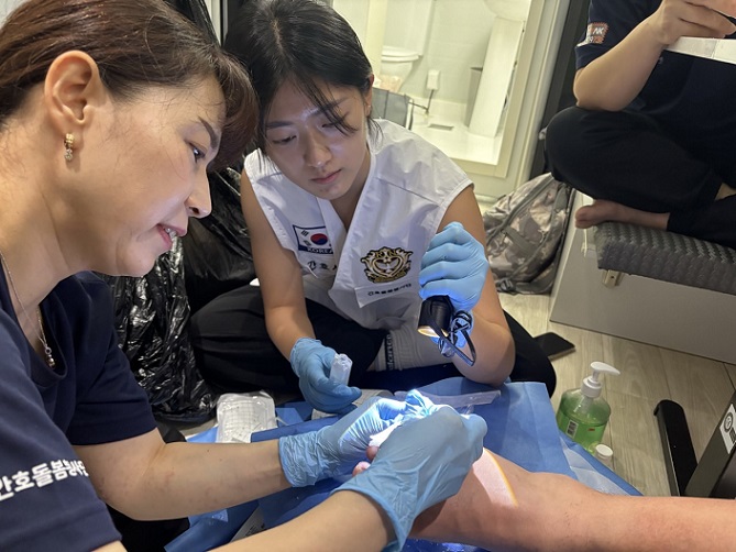 Àü³¯ Àå°Å¸® »êÇà ÈÄ ¹°Áý Á¦°ÅÇÑ Âü°¡ÀÚµéÀº ¾îµÒÀÌ °¡½ÃÁö ¾ÊÀº ¼÷¼Ò¿¡¼ ´Ù½Ã °£È£¸¦ ¹Þ¾Ò´Ù. Á¶¿ëÇÑ ÅÙÆ® ¾È, Á¶½É½º·´°Ô ¼Òµ¶À» ÇÏ´Â °£È£µ¹º½ºÀ»ç´Ü ÆÀ¿øÀÇ ¼Õ±æµé. Ç×»ýÁ¦ ¿¬°í¸¦ ¹Ù¸£°í, Æû µå·¹½ÌÀ» ºÙÀ̸ç, ÃÑ 3°ÇÀÇ Ã³Ä¡¸¦ ¸¶Ä£ ½Ã°£Àº 4½Ã 30ºÐ. ÆÀ¿øµéÀº °£´ÜÈ÷ ±Ùó ½Ä´ç¿¡¼ ¾ÆÄ§À» ÇØ°áÇÑ µÚ, »õº® 5½Ã¿¡ º»°ÝÀûÀÎ ÀÏÁ¤À» ½ÃÀÛÇß´Ù.