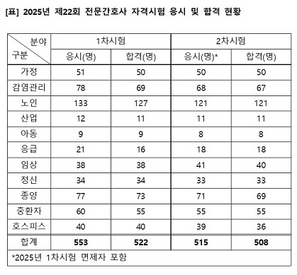 Á¦22ȸ Àü¹®°£È£»ç ÀڰݽÃÇè¿¡¼ ÃÑ 508¸íÀÌ ÃÖÁ¾ ÇÕ°ÝÇß´Ù. À̹ø ½ÃÇè¿¡´Â 1Â÷ ½ÃÇè ¸éÁ¦ÀÚ¸¦ Æ÷ÇÔÇØ ÃÑ 553¸íÀÌ ÀÀ½ÃÇß°í, ÀÌ Áß 522¸íÀÌ 2Â÷ ½ÃÇèÀ» Ä¡·¶´Ù.