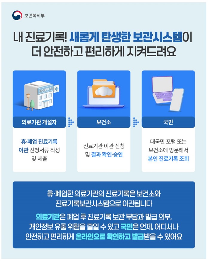 ´Ù´Ï´ø º´¿øÀÌ Æó¾÷ÇÏ´õ¶óµµ ȯÀÚ°¡ Áø·á±â·ÏÀ» ¼Õ½±°Ô È®ÀÎÇÒ ¼ö ÀÖ´Â ±¹°¡ ½Ã½ºÅÛÀÌ ´ëÆø °³¼±µÈ´Ù. º¸°ü ´ë»óÀÌ Çѹæ ÀÇ·á±â°ü±îÁö È®´ëµÇ°í, ¹Ì¼º³â ÀÚ³àÀÇ ±â·ÏÀ» ºÎ¸ð°¡ ¿Â¶óÀÎÀ¸·Î ¹ß±Þ¹ÞÀ» ¼ö ÀÖ´Â ¹üÀ§µµ ³Ð¾îÁø´Ù.