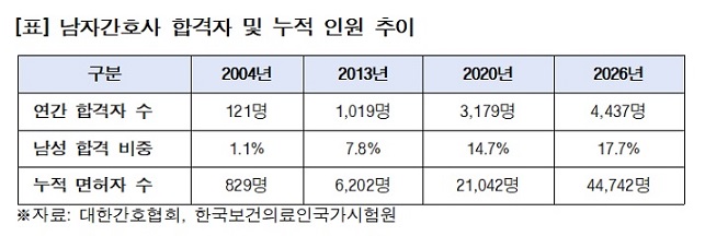 13ÀÏ ´ëÇѰ£È£Çùȸ¿Í Çѱ¹º¸°ÇÀÇ·áÀα¹°¡½ÃÇè¿ø¿¡ µû¸£¸é 2026³âµµ Á¦66ȸ °£È£»ç ±¹°¡½ÃÇè °á°ú ÃÑ 4437¸íÀÇ ³²¼ºÀÌ ÇÕ°ÝÇß´Ù. ÀÌ´Â Àüü ÇÕ°ÝÀÚÀÇ 17.7%¿¡ ´ÞÇÏ´Â ¼öÄ¡´Ù. ÀÌ·Î½á ±¹³» ³²ÀÚ°£È£»ç ¸éÇã ¼ÒÁöÀÚ´Â ÃÑ 4¸¸4742¸íÀ¸·Î Áý°èµÆ´Ù.