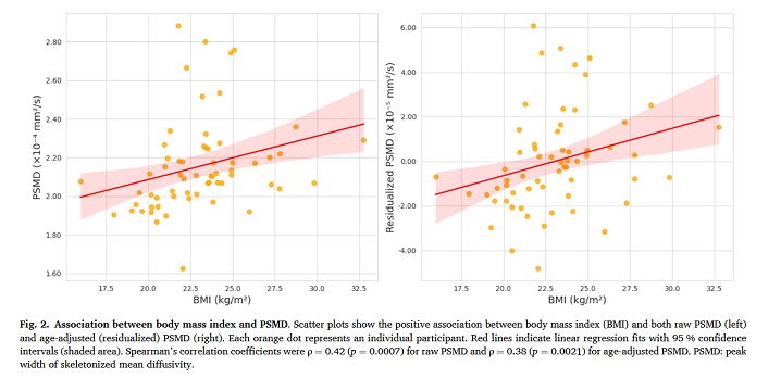 <±×¸² 2. BMI¿Í PSMDÀÇ °ü°è: BMI°¡ ³ôÀ»¼ö·Ï PSMD ¼öÄ¡µµ ÇÔ²² Áõ°¡ÇÏ´Â °æÇâÀ» º¸¿©ÁØ´Ù. À̴ üÁßÀÌ Áõ°¡ÇÒ¼ö·Ï ³ú ¹éÁúÀÇ ¹Ì¼¼ÇÑ ±¸Á¶ º¯È°¡ Ä¿Áú ¼ö ÀÖÀ½À» ÀǹÌÇÑ´Ù.>