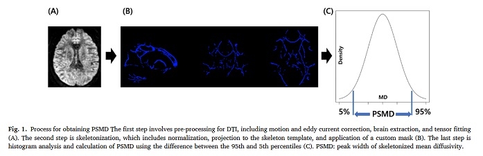 ¿¬±¸ÆÀÀº ³ú MRIÀÇ È®»êÅÙ¼¿µ»ó(DTI)À» ÀÌ¿ëÇØ ³ú ¹éÁúÀÇ ¼Õ»ó Á¤µµ¸¦ Á¤·®ÀûÀ¸·Î ºÐ¼®Çß´Ù. À̶§ »ç¿ëµÈ ÁöÇ¥ÀÎ ‘PSMD(Peak Width of Skeletonized Mean Diffusivity)’´Â ³ú ¹éÁúÀÇ ¹Ì¼¼ÇÑ º¯È¸¦ °¡Àå ¹Î°¨ÇÏ°Ô Æ÷ÂøÇØ³»´Â ¿µ»ó ¹ÙÀÌ¿À¸¶Ä¿·Î ²ÅÈù´Ù.