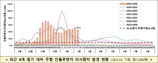 Áúº´Ã»ÀÇ ÀÇ¿ø±Þ Ç¥º»°¨½Ã °á°ú¿¡ µû¸£¸é ¿ÃÇØ 7ÁÖÂ÷(2.8.~2.14.) ÀÎÇ÷翣ÀÚ ÀÇ»çȯÀÚ ºÐÀ²Àº ¿Ü·¡È¯ÀÚ 1000¸í´ç 45.9¸íÀ¸·Î ³ªÅ¸³µ´Ù. ÀüÁÖ(52.6¸í)º¸´Ù´Â ¼ÒÆø °¨¼ÒÇßÀ¸³ª À̹ø Àý±â À¯Çà ±âÁØÀÎ 9.1¸í°ú ºñ±³ÇÏ¸é ¿©ÀüÈ÷ 5¹è³ª ³ôÀº ¼öÁØÀÌ´Ù.