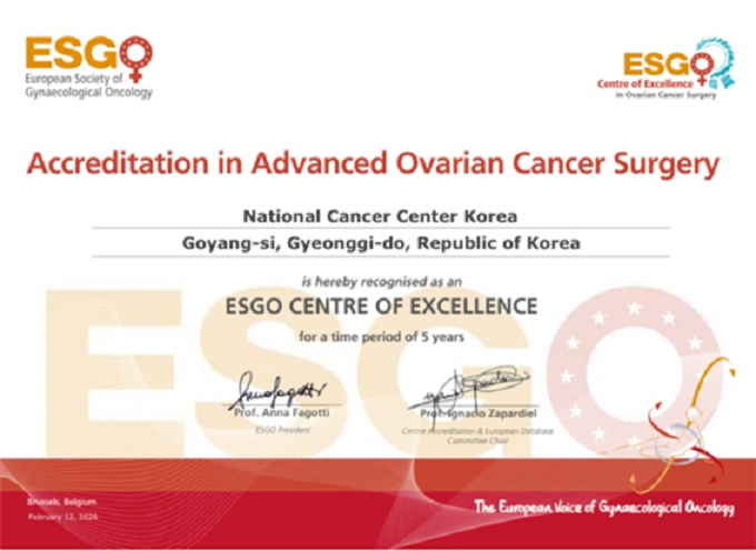 ±¹¸³¾Ï¼¾ÅͰ¡ ºÎÀÎÁ¾¾ç ºÐ¾ß ÃÖ°í ±ÇÀ§¸¦ ÀÚ¶ûÇÏ´Â À¯·´ºÎÀÎÁ¾¾çÇÐȸ(ESGO)·ÎºÎÅÍ ±¹³» ÃÖÃÊ·Î ‘ÁøÇ༺ ³­¼Ò¾Ï ¼ö¼ú ÀÎÁõ(Accreditation in Advanced Ovarian Cancer Surgery)’À» ȹµæÇÏ¸ç ¼¼°èÀûÀÎ ³­¼Ò¾Ï Ä¡·á °ÅÁ¡À¸·Î¼­ÀÇ ÀÔÁö¸¦ ´ÙÁ³´Ù.