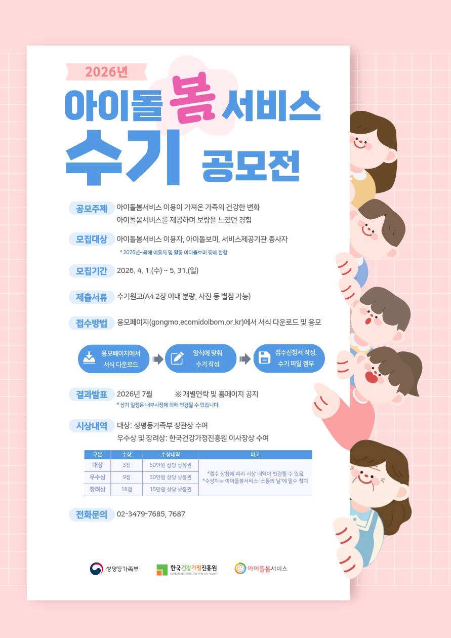 ¼ºÆòµî°¡Á·ºÎ¿Í Çѱ¹°Ç°­°¡Á¤ÁøÈï¿øÀº ¿À´Â 4¿ù 1ÀϺÎÅÍ 5¿ù 31ÀϱîÁö ‘2026³â ¾ÆÀ̵¹º½¼­ºñ½º ¼ö±â °ø¸ðÀü’À» °³ÃÖÇÑ´Ù°í ¹àÇû´Ù.